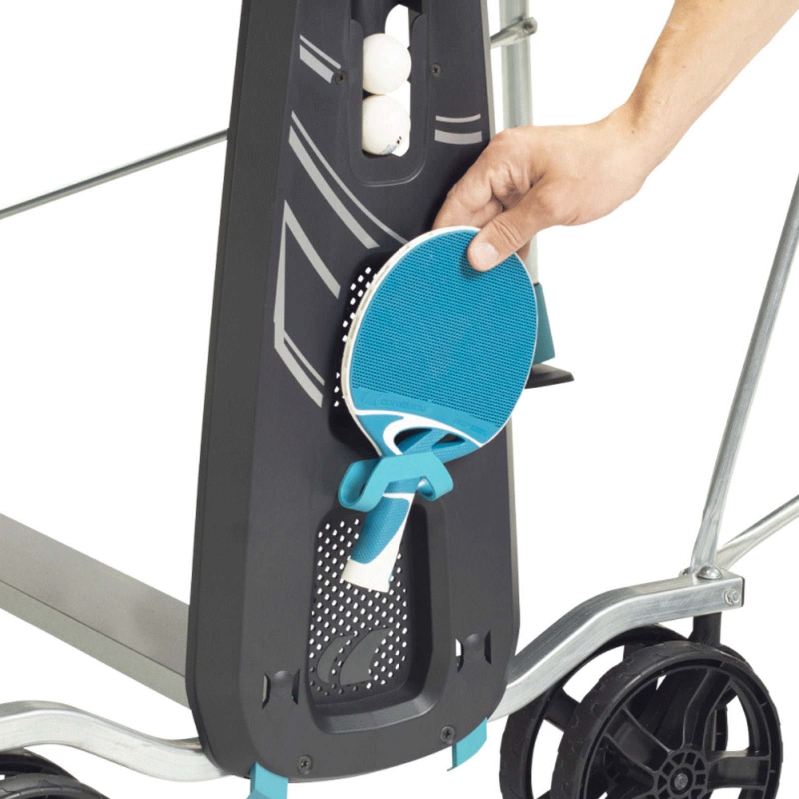 For added convenience, the built-in accessory storage keeps essentials within reach. The side panels feature dedicated holsters for up to four paddles and four balls, keeping your equipment organized.